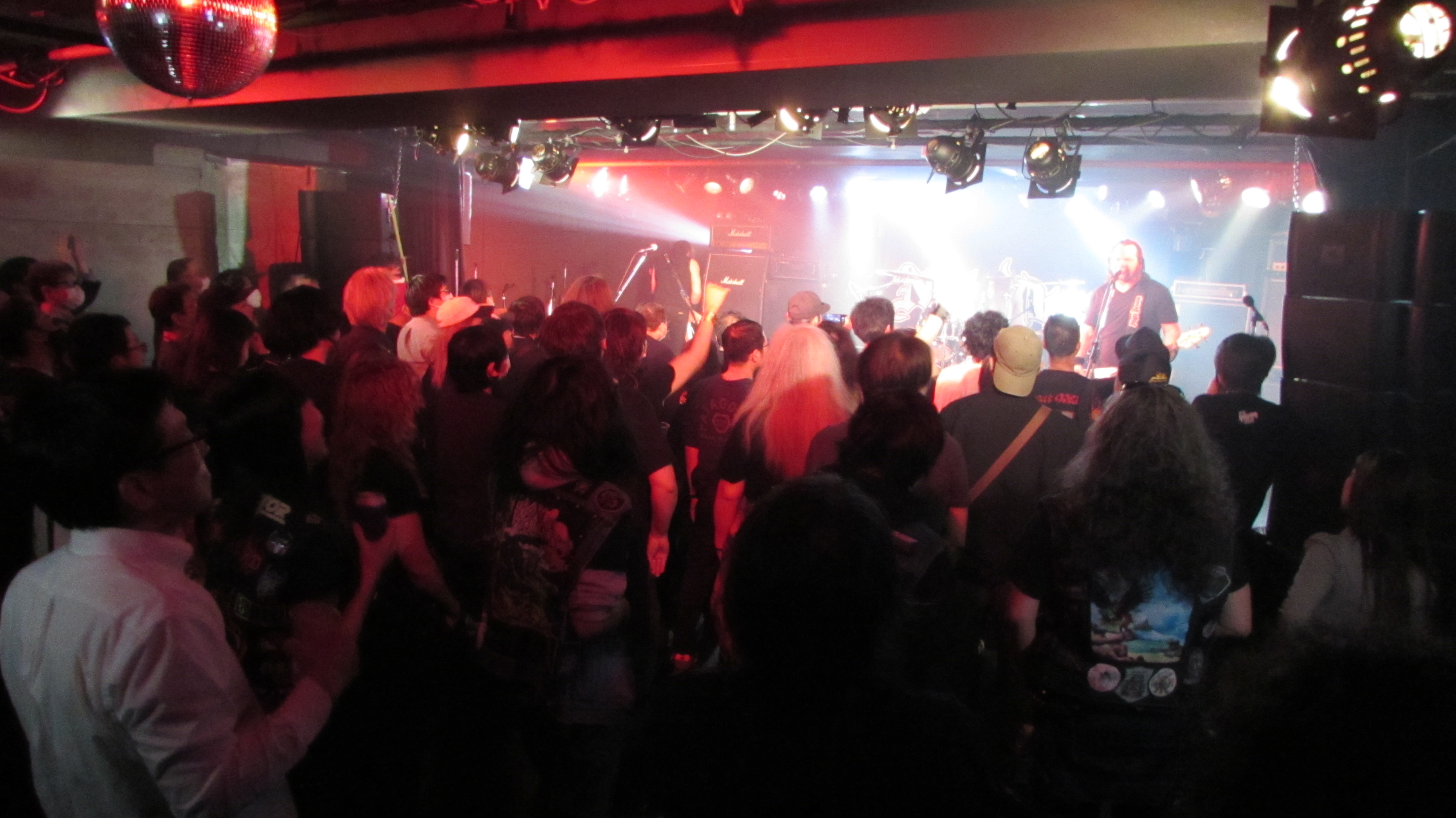 So, it’s just Jarvis, Joe and myself who drive the gig. We arrive, unload, I go and park the van and by the time I get back, Dan has arrived and he and Jarvis and have taken almost everything down the two flights of stairs. It’s an easy set-up, plenty of time and we have time and space to put the backdrop up first, nice and secure. Around 4pm, I start to feel ill. Tired and ill. I make sure the support band, End All, are set up and then I lay down for a while but it doesn’t go away. Armand and Christina have decided to stay in Shinjuku for the night Armand so after an interview with Young Guitar, they go to check into their hotel. I hope they make it back in time. Satoshi from End All requests that Night Demon play Maiden Hell as the song means a lot to him. Jarvis says they will, providing Satoshi introduces the song and sings two of the verses. Satoshi can’t believe his luck and accepts. Around 6pm, I decide a coffee might help my tiredness. Amazingly, it does and adrenalin starts to flow. Armand and Christina make it back. At 6:50pm, I let End All know that it’s 10 minutes to stage time and go out front. It’s a good crowd, bigger than last night. 7pm, End All onstage, 7:30pm, End All finish. We changeover equipment with fifteen minutes to spare. Bang on 8pm, Night Demon go on and perform the entire Outsider album. After half an hour, I get word that they want the air conditioners off as it’s too cold on stage. It gets done and I stay side with towels and a bottle of water for Jarvis as he’s sweating buckets. After Outsider, they do a few classics, Dan does his Rocky bit during The Chalice and then the encore. Satoshi goes on stage, isn’t sure what to say so they launch into the song. He’s not too sure of the words either but everyone seems to having a good time. One more song, Night Demon and the show is over.