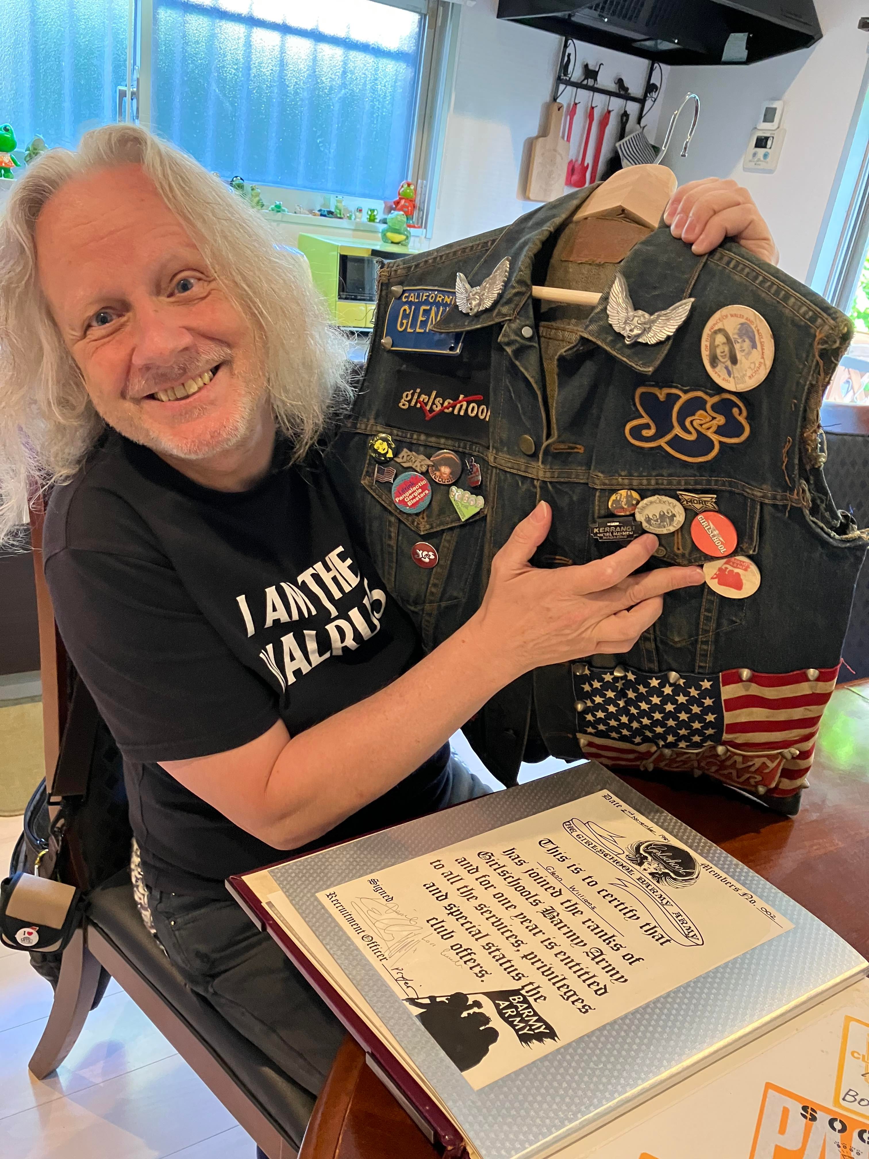 GW: ケン(中央)は、古くからのバーミー・アーミーのメンバーだった一人だ。が、実はリーはアマチュア写真家で、ロックのライブにたくさん行っていた。彼は僕を初めてRock Goddessのギグに連れて行ってくれて、バンドを紹介してくれた人なんだ。ちょっと待って...(グレンは古い袖を切ったGジャンを持ってくる)。
